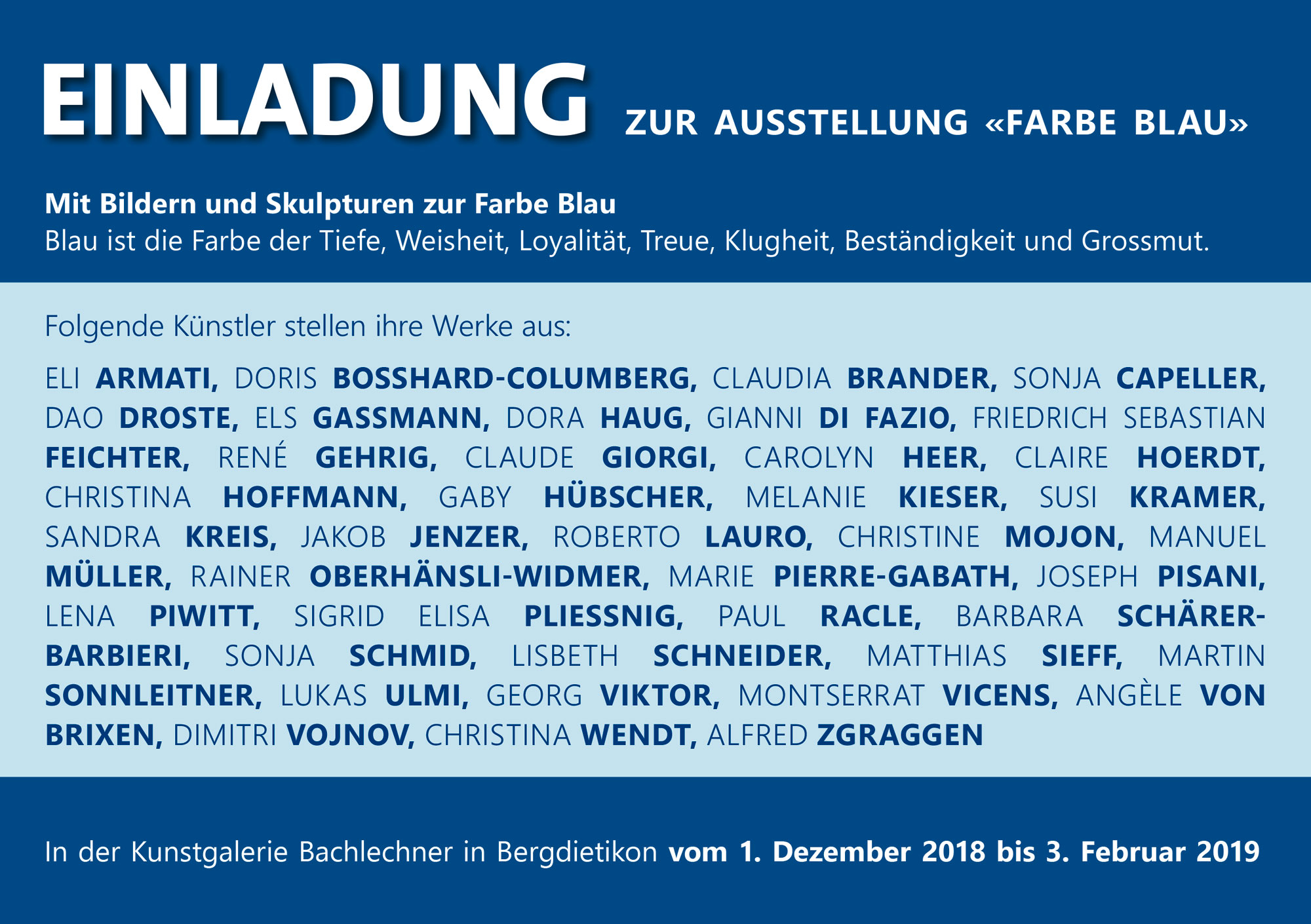 Ausstellung «Farbe Blau», 1. Dezember 2018 – 3. Februar 2019, Kunstgalerie Bachlechner Bergdietikon Ausstellung «Farbe Blau», 1. Dezember 2018 – 3. Februar 2019, Kunstgalerie Bachlechner Bergdietikon Weiterlesen